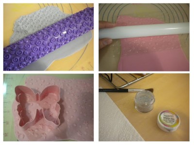 | Estiramos fondant de color y con un rodillo texturizador o una plantilla hacemos relieves. Cortamos, pegamos y con el fondant blando y un pincel seco añadimos la purpurina comestible. |