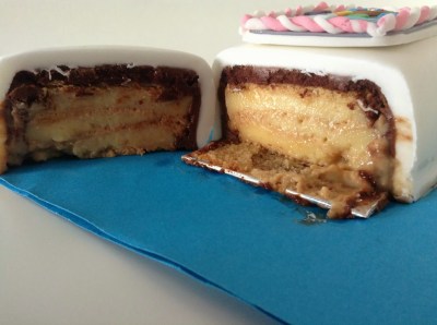 A Tito no le gustan mucho las tartas de bizcocho y tampoco el buttercream, su relleno preferido es la crema pastelera, por eso esta tarta es una de galletas con crema pastelera. Al ser mini la pude manejar más o menos pasando por frío. Además el fondant no es recomendable meterlo al frigo, pero si es no-frost no se humedece y lo soporta mejor. Esta tarta es imprescindible meterla por la crema.