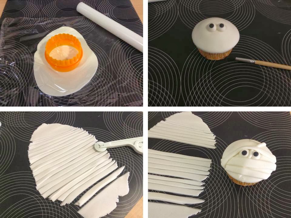 Para la momia ponemos una capa de buttercream , y a continuación lo cubrimos de fondant blanco. Para que quede con los bordes redondeados, lo cortamos poniendo film transparente encima del fondant. Colocamos los ojos y disponemos tiras a forma de vendas por todo el cupcake.