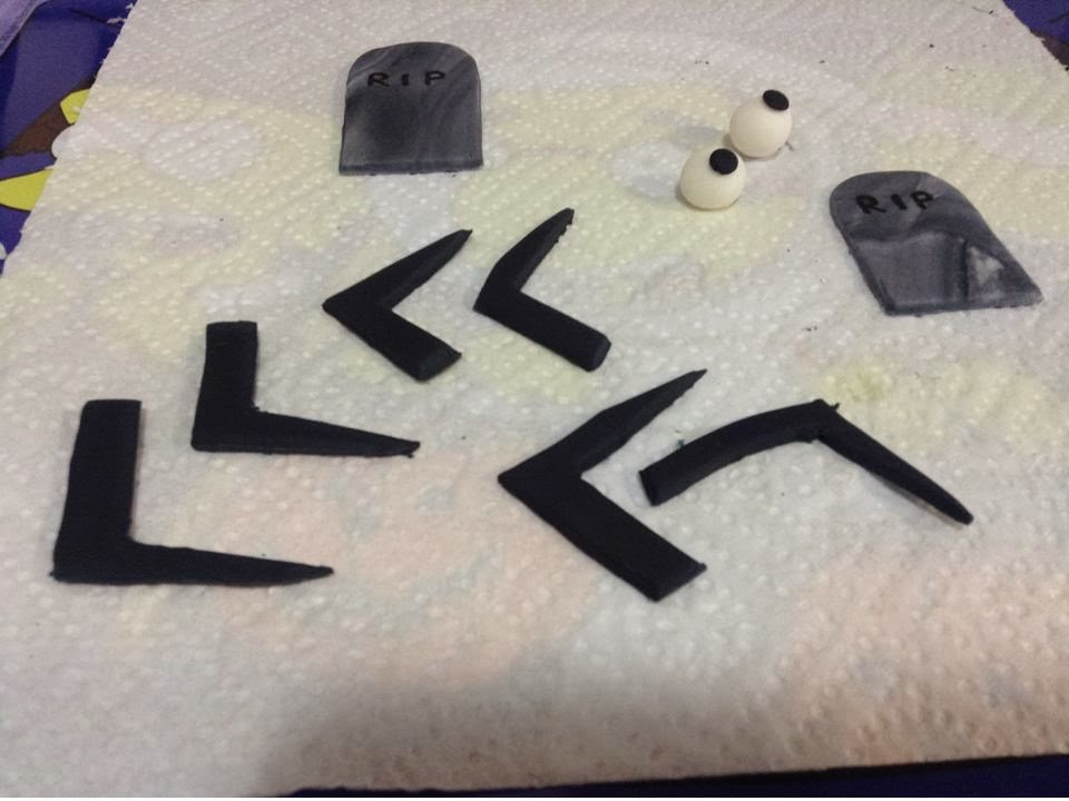 Uno o dos días antes tenéis que preparar las decoraciones en fondant, como las patas de araña, las piernas de bruja y las lapidas, porque necesitamos que estén rígidas a la hora de ponerlas en el cupcake. Para que no se ablanden demasiado al meterlas en la crema, haced las mismas con CMC, el polvo de tilosa que endurece nuestro fondant.Para el efecto de mármol de las lapidas, mezclamos fondant blanco con gris pero solo un poco, para que se vean las vetas de diferente color.