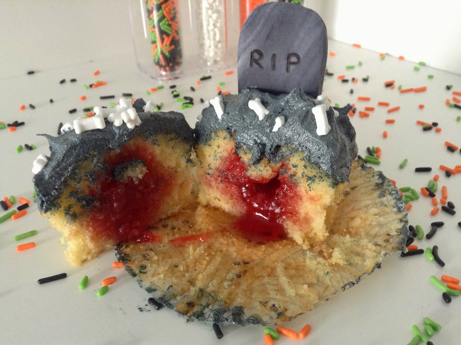 Unos cupcakes de vainilla, los básicos, pero rellenos de sirope de fresa y decorados de muerte. Para el próximo jueves, serán la delicias de todos.