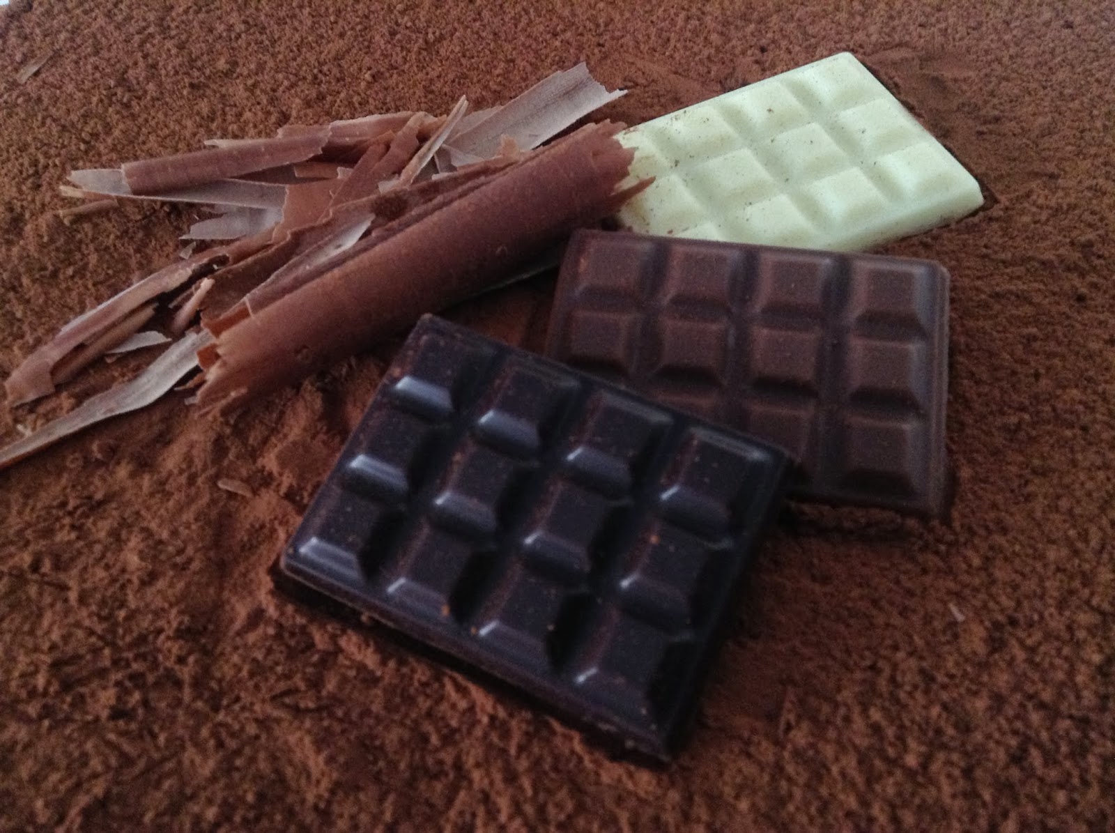 Solo queda espolvorear la superficie con una buena capa de cacao en polvo y hacer unas virutas de chocolate (raspamos con un cuchillo liso y un poco ancho, el dorso de una tableta a todo lo largo, de arriba hasta abajo)