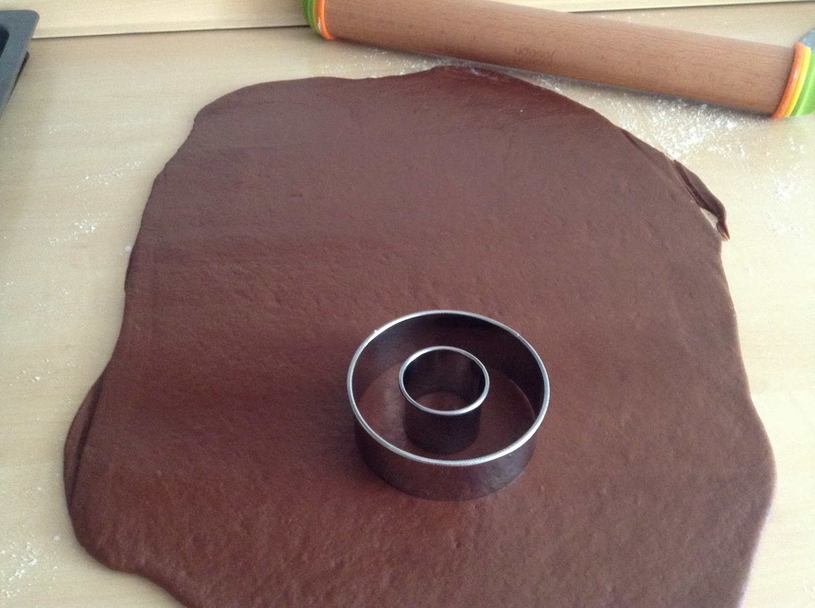 | Estiramos en la mesa con el rodillo y hacemos los donuts con dos círculos ( si no tienes cortador de donuts) |