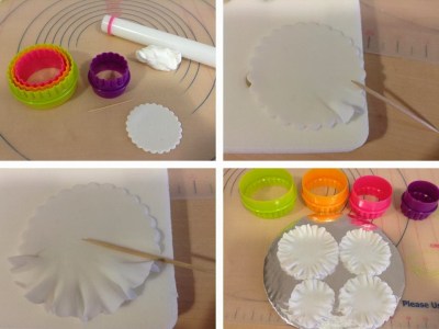 | Cortamos cuatro círculos de diámetros diferentes con los cortadores rizados. Encima de una almohadilla de flores o foam, ponemos los círculos en el borde y con un palillo rizamos desde el centro hasta el borde. Os paso un tutorial del blog de Alma, Objetivo: Cupcake perfecto. |