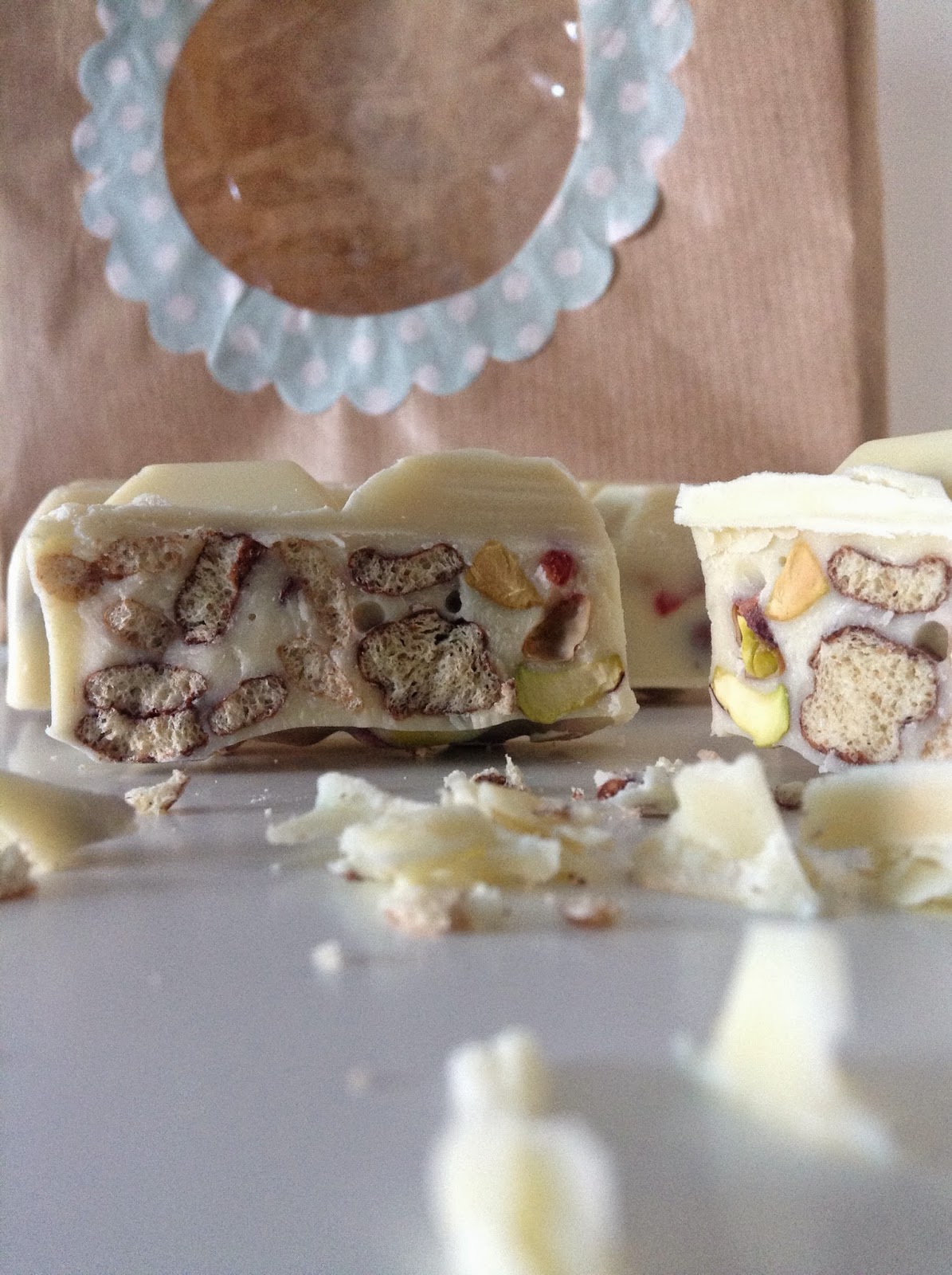 Al baño maría o en el micro (de 30 en 30 segundos con cuidado de no quemarlo), derretimos el chocolate blanco con la manteca. Para que nos quede la cara bonita de nuestro turrón bien lisa, ponemos un poco del chocolate derretido en el fondo del molde y lo metemos al frigo unos minutos. Luego añadimos los pistacho y las cerezas al chocolate derretido sobrante y dejamos templar la mezcla. Por último echamos los cereales para que queden crujientes. Terminamos de rellenar los moldes de silicona hasta arriba y los golpeamos suavemente contra la encimera para que no queden burbujas de aire. Metemos al frigo al menos 2 horas o hasta que esté sólido.
