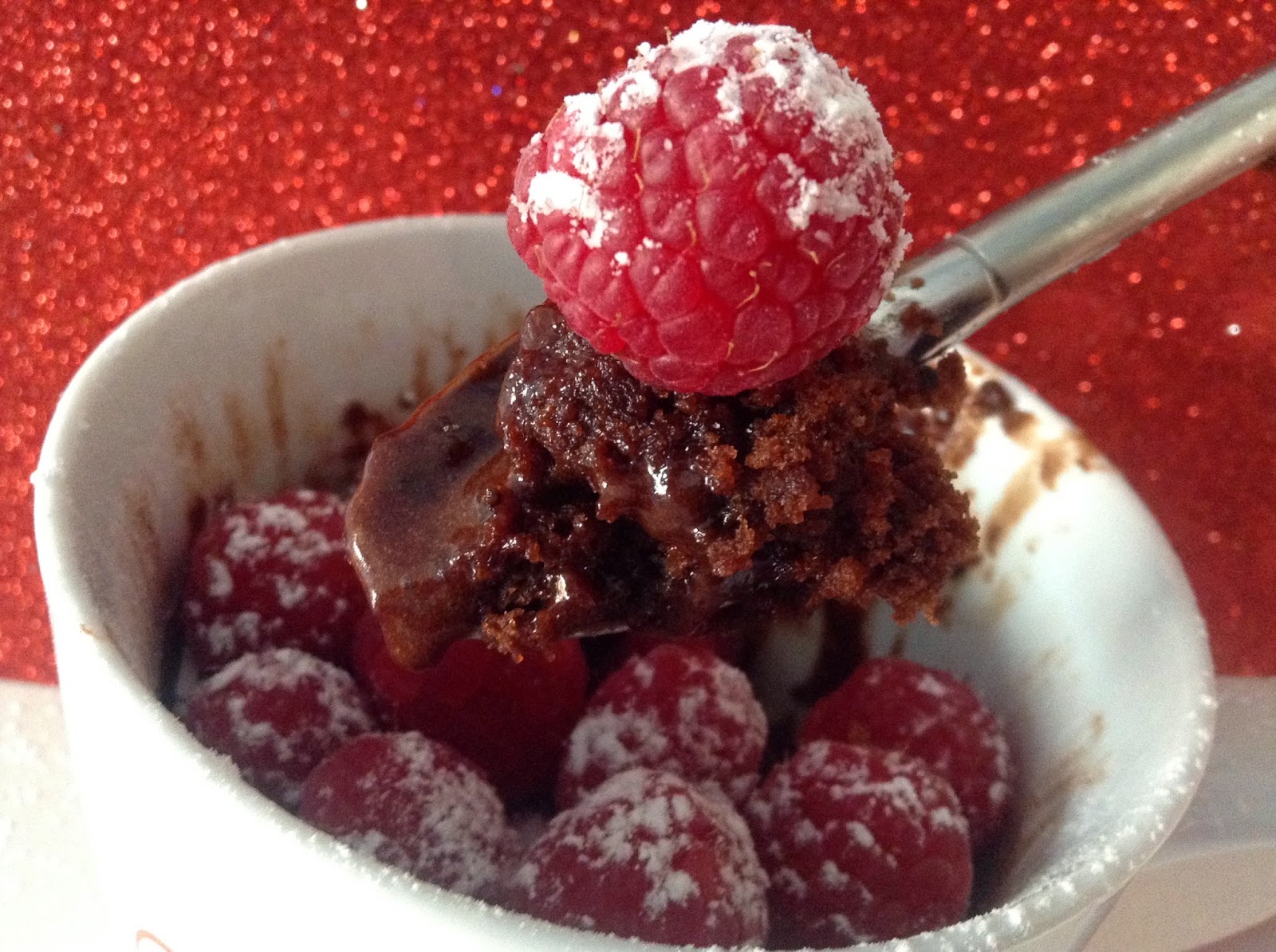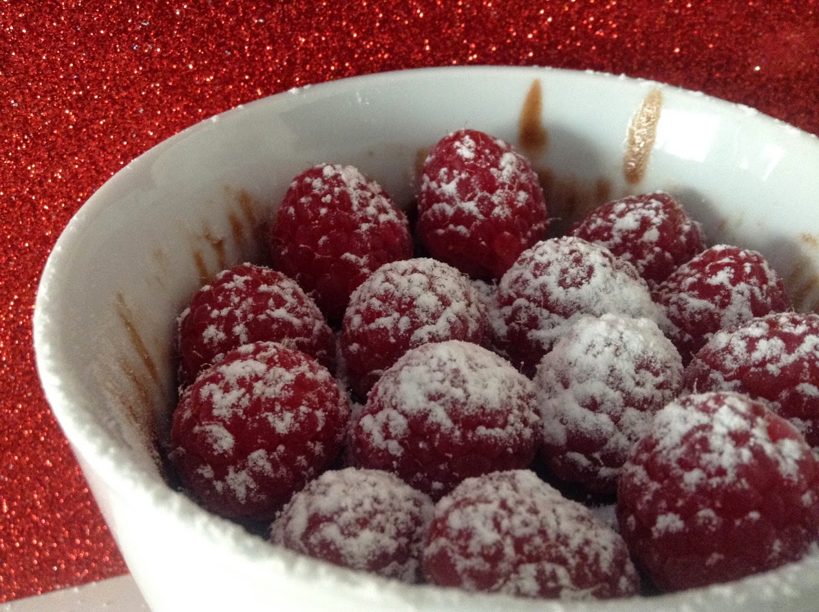 Dejamos templar un poco, decoramos con unas frambuesas frescas, espolvoreamos un poco de azúcar glasé y a disfrutar acompañados con dos cucharas y de vuestro amorcito……o no ¿?