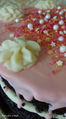 Echamos los candy melts encima de nuestro bizcocho, llevando con la espátula hacia los bordes para que chorree un poco y seguido los sprinkles decorativos en el centro. Metemos unos 5 min en el frigo y la sacamos para poner con la manga pastelera unos rosetones con el poquito de la ganache de chocolate blanco reservado (boquilla 2D de Wilton).