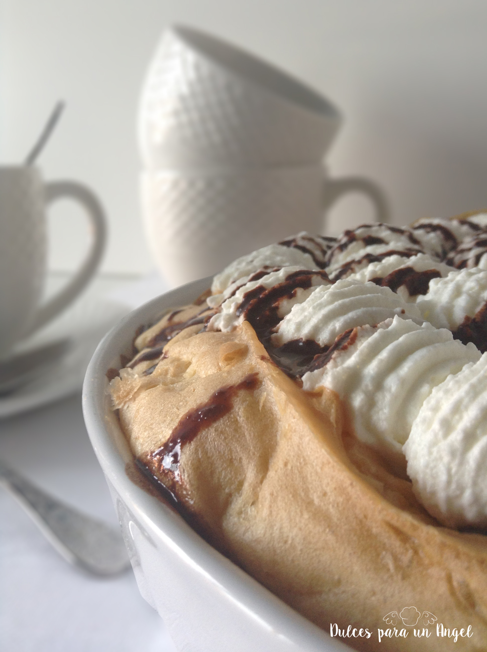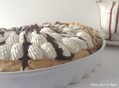 Antes de servir, decoramos con nata y salsa de chocolate líquida. Metemos la nata montada en una manga pastelera y decoramos al gusto. Yo he usado una boquilla grande y rizada.