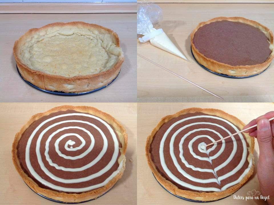 Solo tenemos que hacer una espiral con el chocolate blanco desde el centro hacia afuera y luego con una brocheta o palillo hacemos lineas desde el centro a los bordes para formar el dibujo. Así: