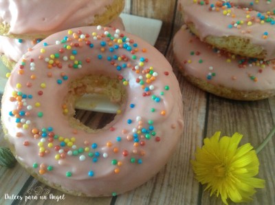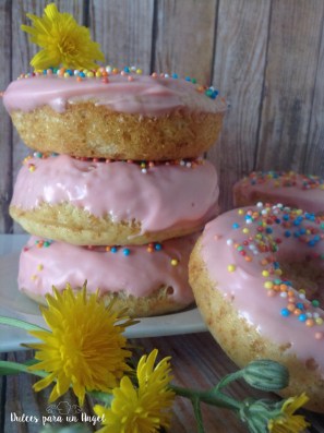 Es un bizcocho de vainilla horneado en un molde de donuts y cubierto en este caso por candy melts rosas, decorado con bolitas de colores. Otras veces les cubro de chocolate con leche, chocolate blanco, lo que tenga a mano.