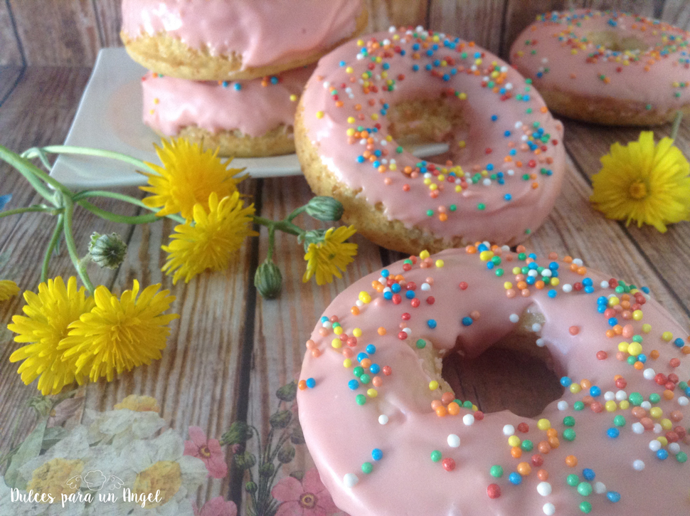 Es un bizcocho de vainilla horneado en un molde de donuts y cubierto en este caso por candy melts rosas, decorado con bolitas de colores. Otras veces les cubro de chocolate con leche, chocolate blanco, lo que tenga a mano.