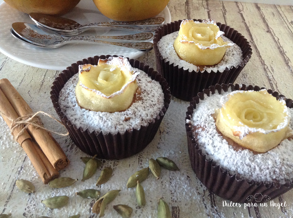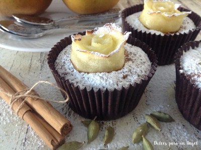 Los disponemos en fila superponiendo cada uno a la mitad del anterior y los enrollamos. Ponemos cada rosa en una cápsula y horneamos unos 15 minutos, o hasta que veamos que los bordes se tuesten ligeramente. Os pongo un enlace con un paso a paso de El invitado de invierno de las rosas (aunque en ese caso llevan hojaldre) para que os hagáis una idea.