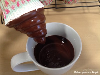 Ponemos en una taza o tazón alto y amplio (lo suficiente para que entre el cucpake con holgura) el chocolate troceado con la manteca de cacao. Lo ponemos al microondas en tandas de 30 segundos y removiendo en cada una, hasta que el chocolate se disuelva por completo.