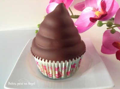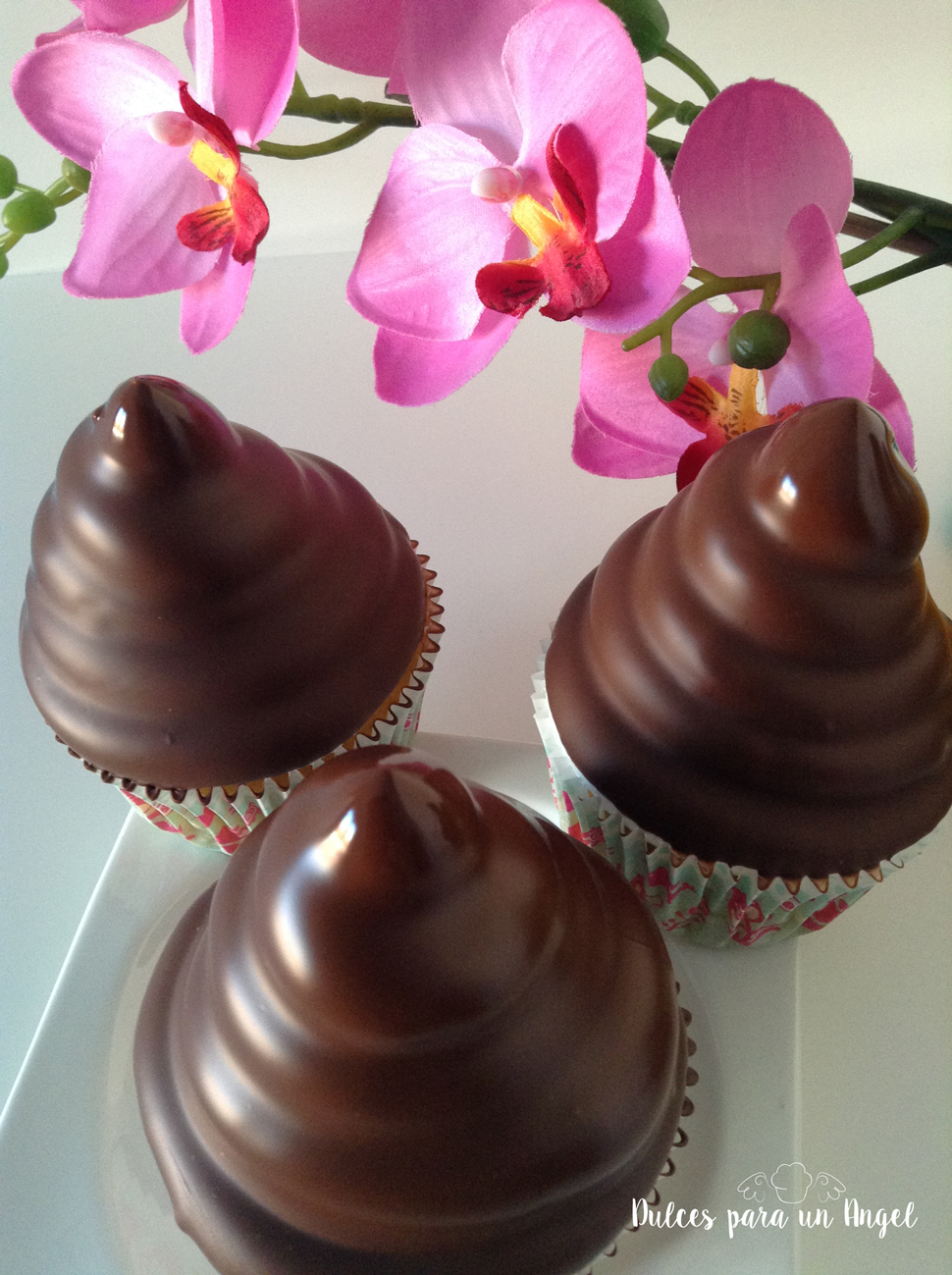 Mientras se entibia nuestro chocolate un poco, metemos los cupcakes con el merengue en el congelador por unos 5 minutos. Es un paso muy importante para que el merengue esté firme y la capa de chocolate se solidifique rápido. Metemos el cupcake boca abajo en la taza hasta el borde de la cápsula, levantamos, dejamos gotear el exceso de chocolate y cuando deje de gotear, ponemos los cupcakes derechos y dejamos que enfríen del todo. Debemos ir sacando poco a poco los cupcakes del congelador para que conserven el frío.