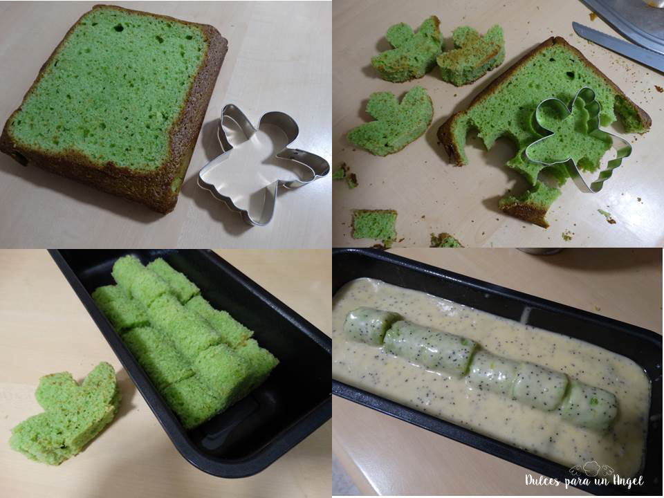 Cortamos los ángeles con el corta pastas y los alineamos en el molde rectangular bien juntos. Echamos la mezcla de masa con las semillas de amapola reservada en el frigorífico (lo ideal es que cubriera por completo la linea de ángeles) y horneamos, unos 20-25 min. Hay que observarlo y estar pendientes.