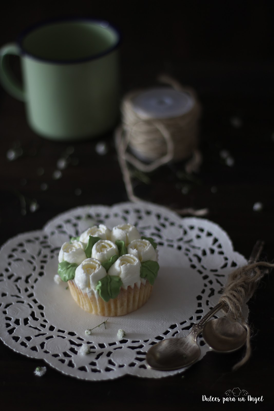 Receta del bizcocho un poco modificada del libro de Las recetas de la pastelería Hummingbird con una crema recién descubierta que se ha convertido en una de mis preferidas, crema de mascarpone y nata, para que salieran unas flores blancas, ya que las cremas de mantequilla siempre amarillean un poco; Sabe a nata azucarada pero con una consistencia maravillosa (aunque con el triple de calorías!) y que debe conservarse en nevera.
