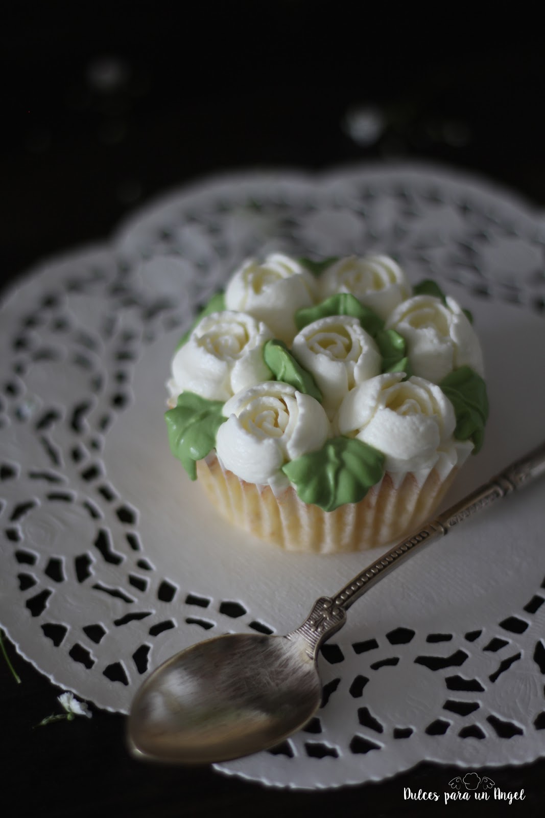 Para hacer las flores solo hay que presionar la manga y dejar salir la crema por la boquilla, sin ningún tipo de esfuerzo tenemos unas flores preciosas para decorar nuestros cupcakes, no son una maravilla? Y para rematar colocar unas hojas de forma aleatoria.