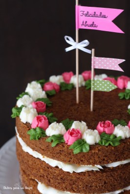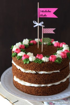 Una tarta con cupcakes «a juego» para la madre de mi amiga María. Son Naked cake, es decir, tarta desnuda pero con una espectacular presencia.