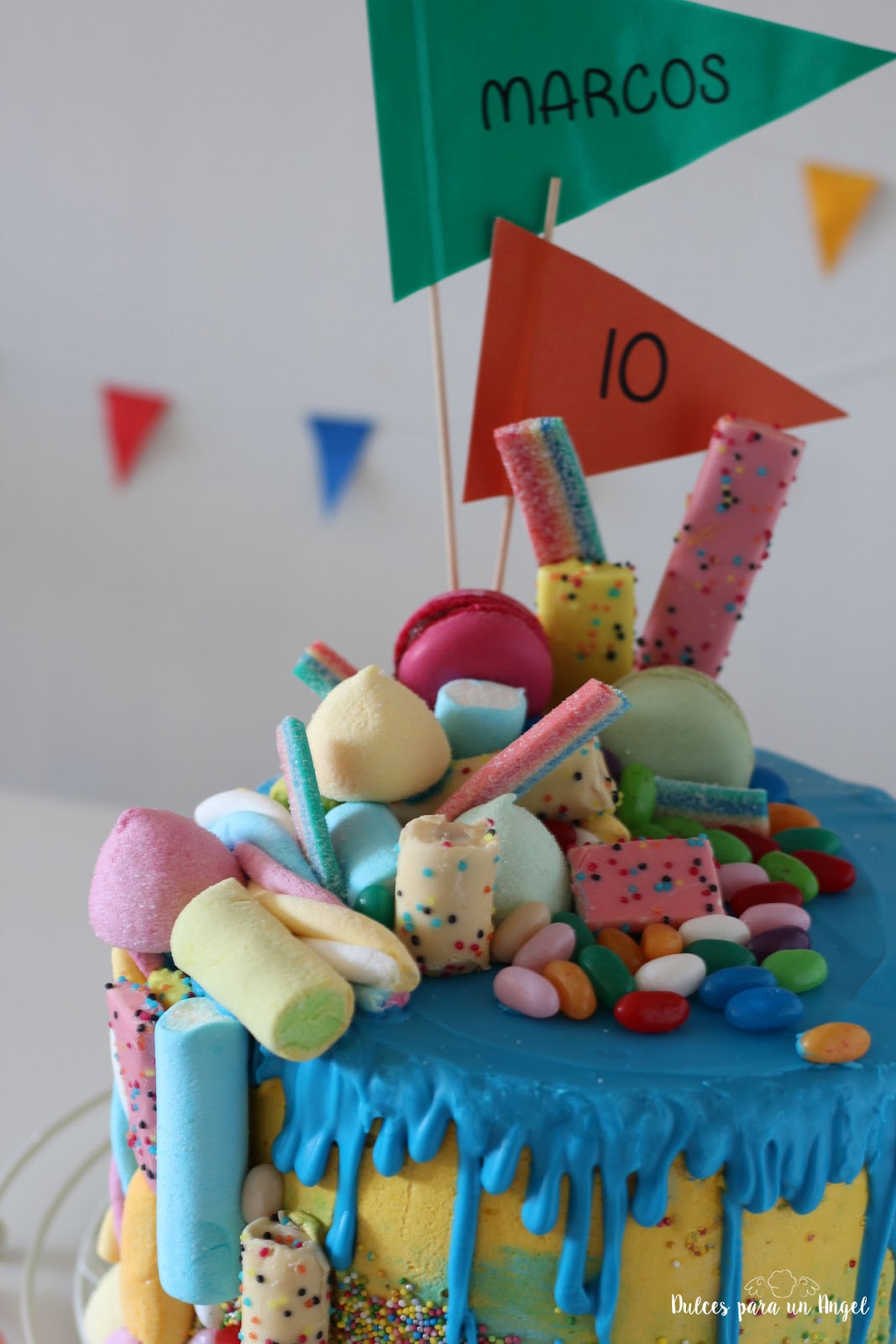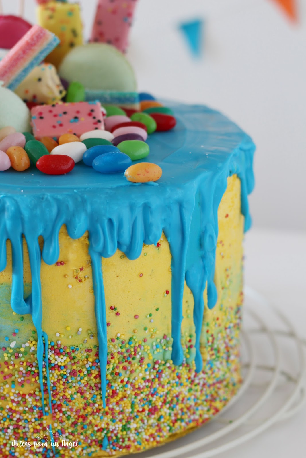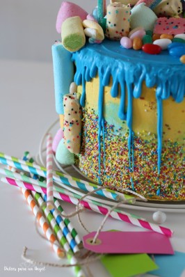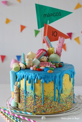 Una tarta drip cake llena de chuches y colores. Con 4 bizcochos de distintos sabores (chocolate, caramelo toffee, oreo y cookies) y 3 cremas (buttercream de chocolate intenso, buttercream básico de vainilla y crma de harina sabor caramelo toffee)