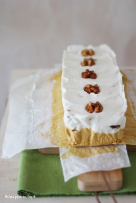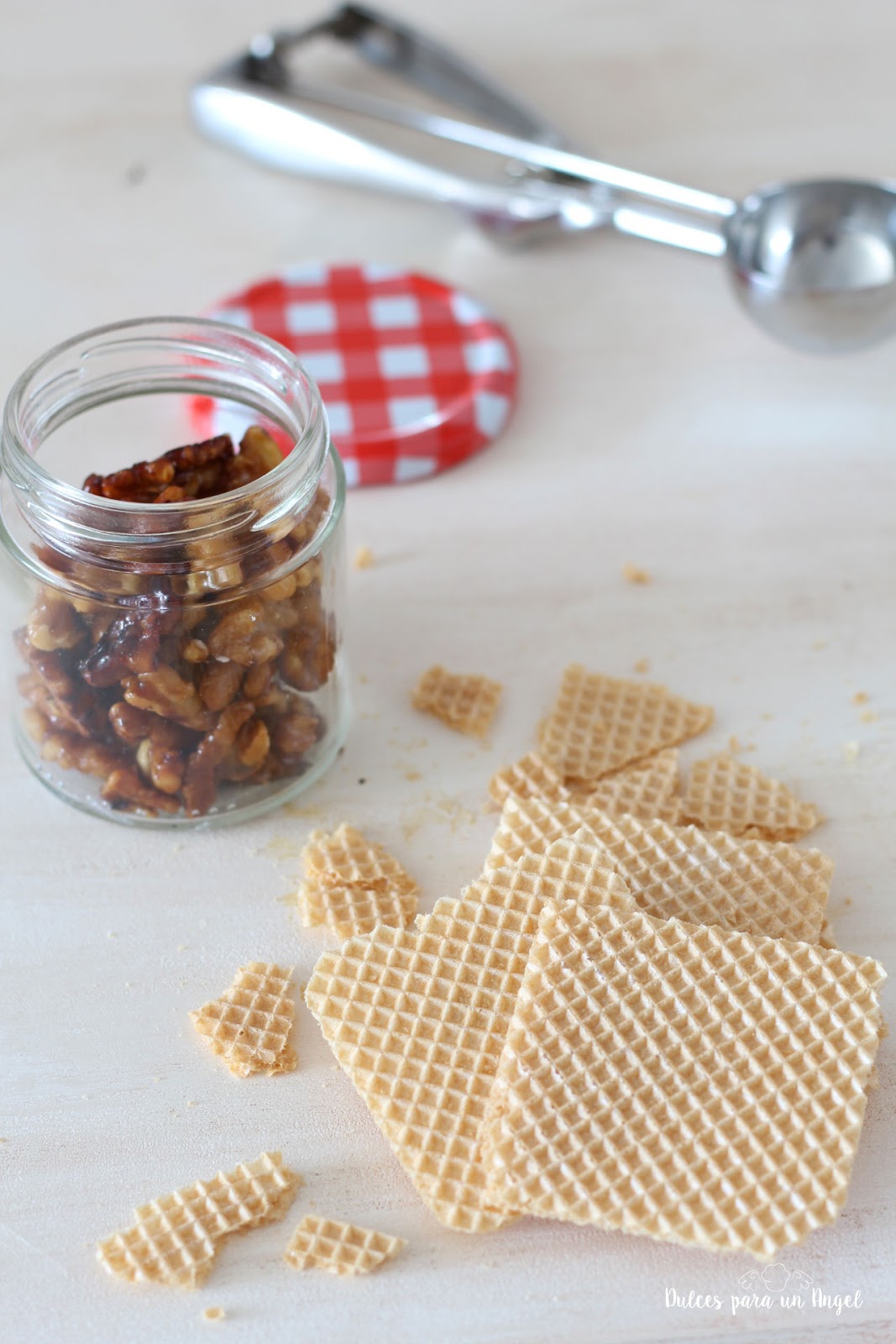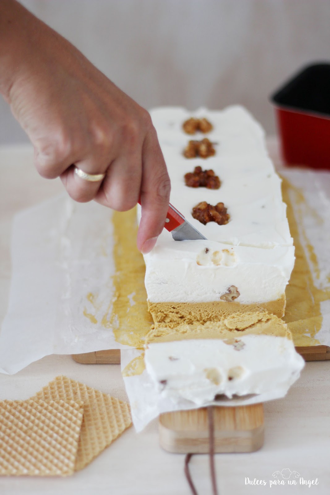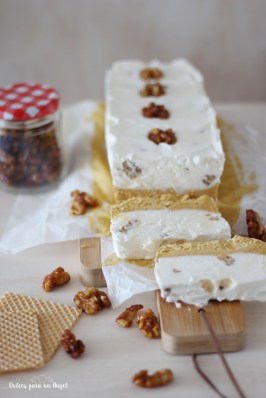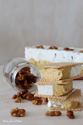 Sacamos nuestro molde con el helado de toffee del congelador y vamos echando cucharadas de helado de nata y trozos de nueces hasta rellenar el molde por completo, podemos adornar la superficie con unas nueces enteras. Cubrimos con film transparente y llevamos al congelador al menos 24 horas. Servimos en forma de sándwiches entre dos galletas para helados.