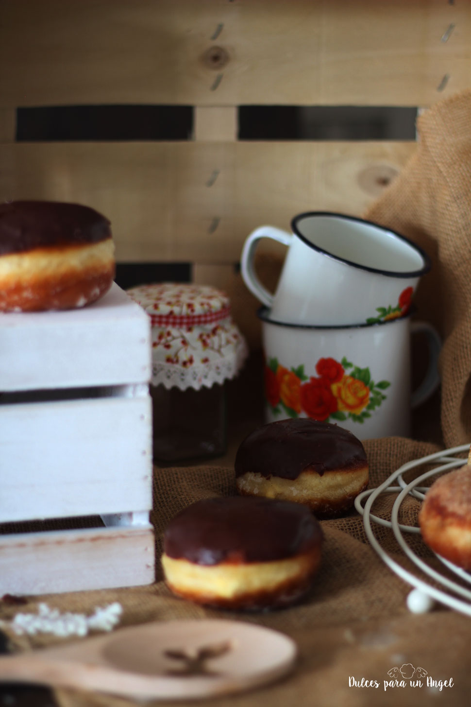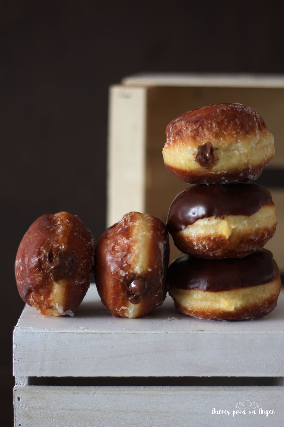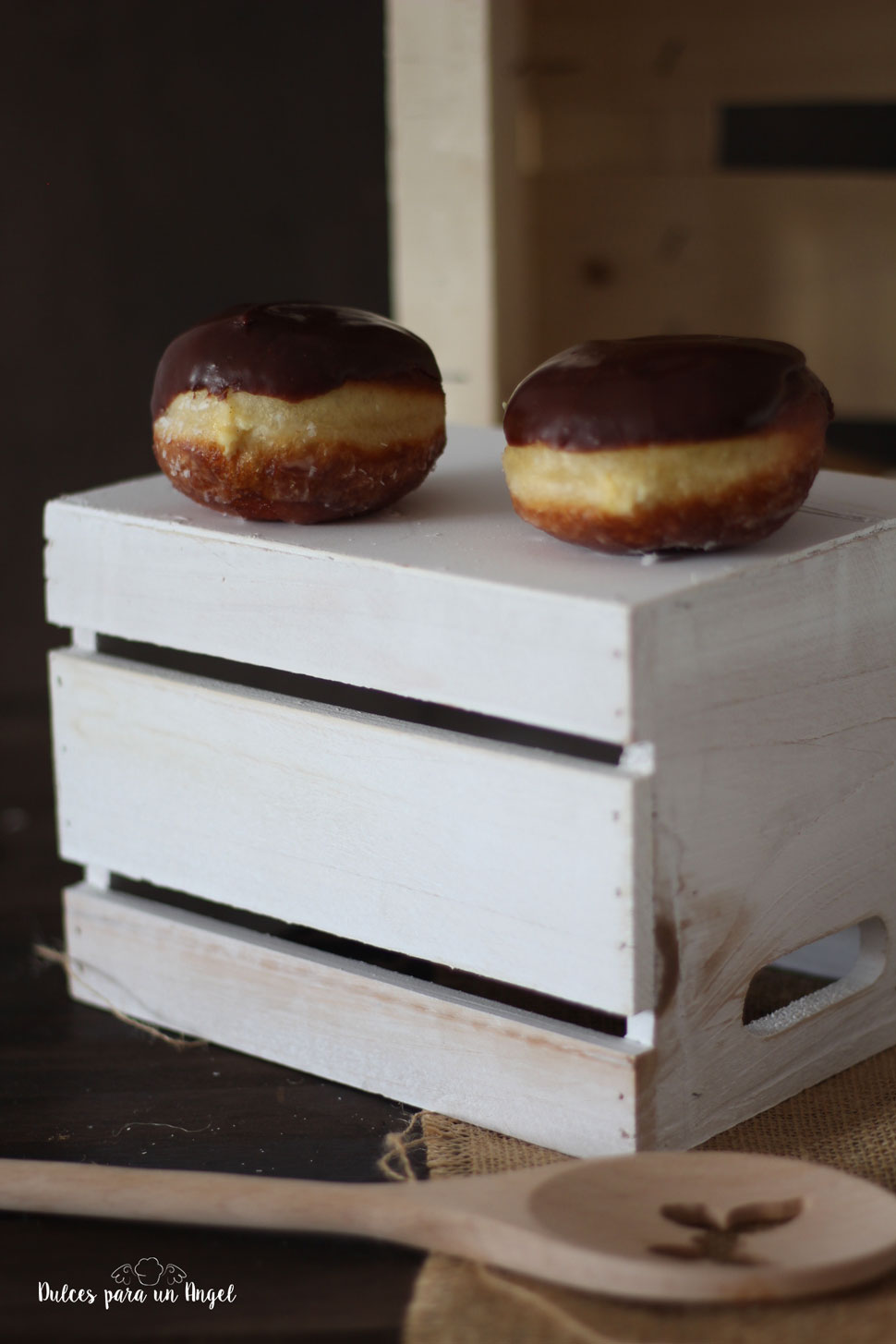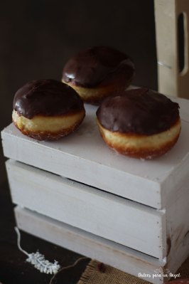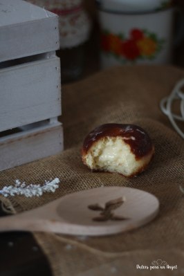 Una vez frías las berlinas, introducimos la parte superior en el glaseado de chocolate, procurando que suelte el exceso.
