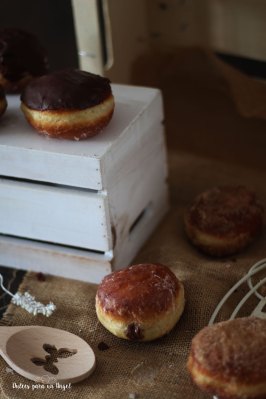 Pasado el tiempo, ponemos un cazo con el aceite a calentar (170º-´180º) Recortamos el papel de hornear que hay debajo de cada berlina y las dejamos separadas unas de otras. Es una forma de no tener que manipular las berlinas que al cogerlas con las manos se pueden aplastar un poco. Echamos en el aceite caliente cada berlina con su papel pegado, al entrar en contacto con el aceite caliente se separará sólo sin ningún esfuerzo. Freímos las berlinas en tandas de 2 o 4 como máximo durante un par de minutos por cada lado. Retiramos y ponemos encima de papel de cocina para las berlinas que lleven glaseado, para las berlinas que se rebocen en azúcar, debemos de ser rápidos y tras unos segundos en el papel de cocina, las rebozaremos porque si no, el azúcar no se quedará pegado.