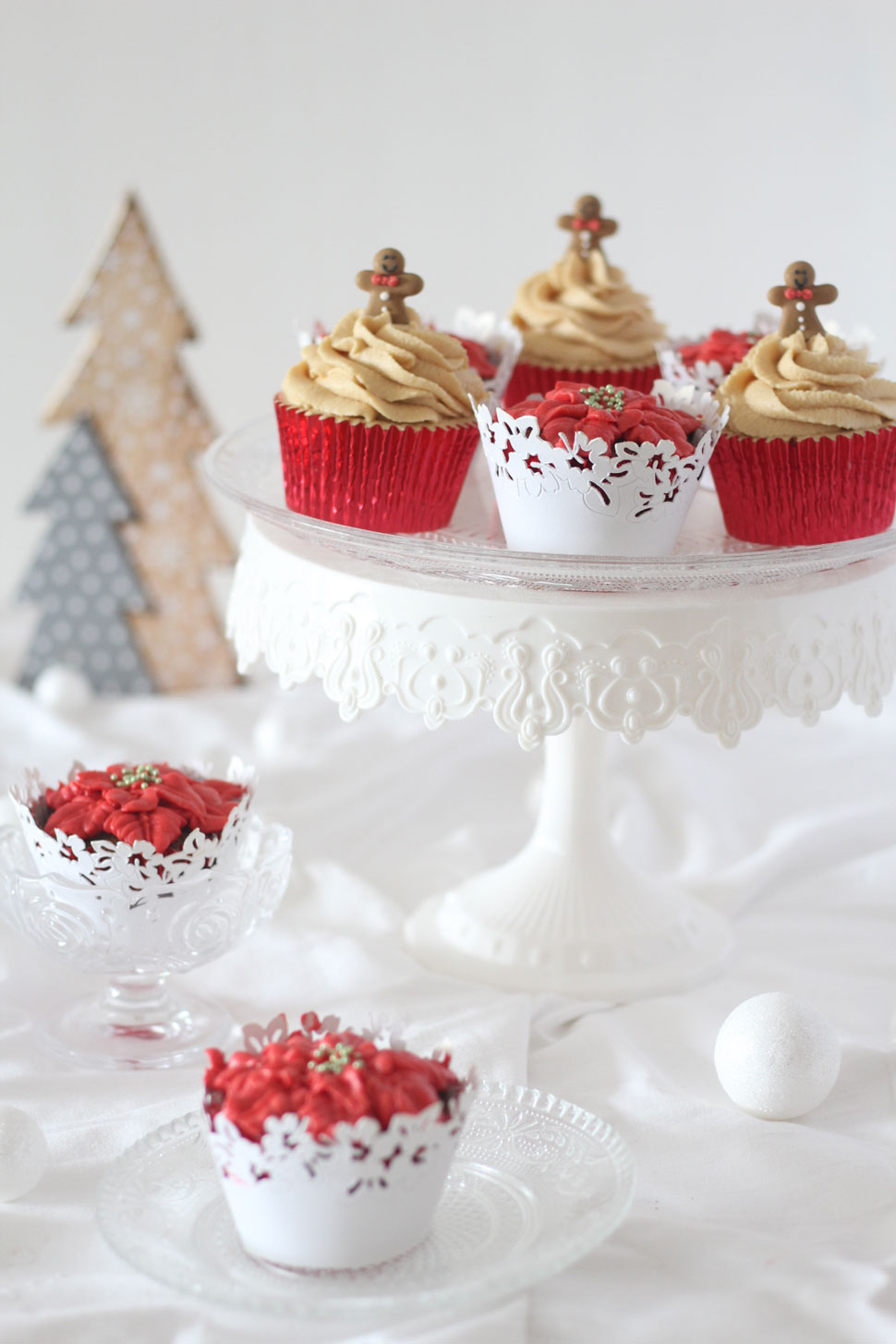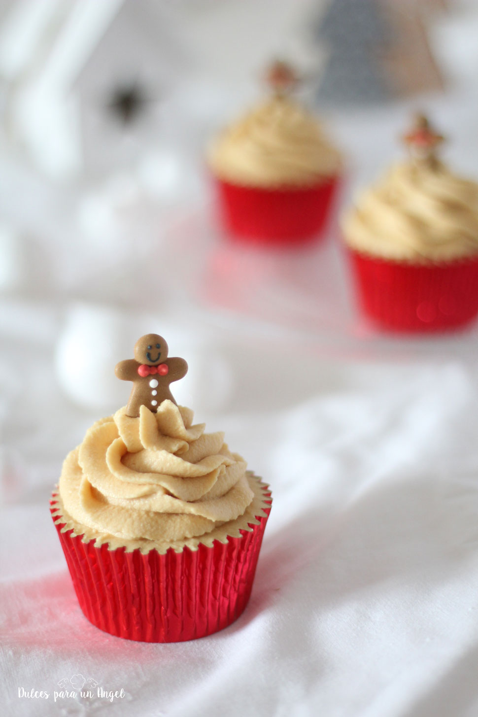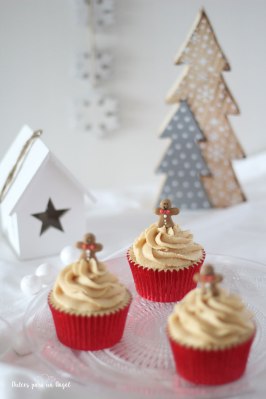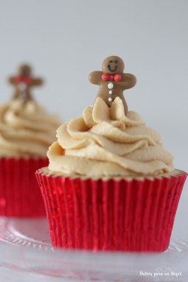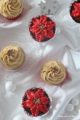 En éste caso he optado por un bizcocho y una crema de mascarpone con sabor a chai latte. Para la decoración no he podido hacer una sola, he hecho unas poinsettias y una decoración tradicional con unos hombrecillos de jengibre monérrimos. Adoro los cupcakes!! 🙂
