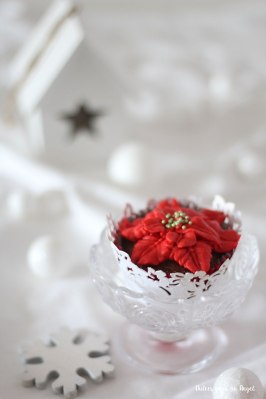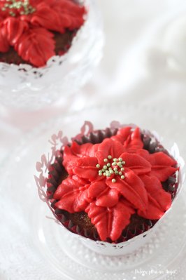 Teñimos la crema con colorante en pasta red extra para dar un tono intenso de rojo. Con la boquilla 68 de wilton o cualquier otra con para hacer hojas, hacemos 5 o 6 hojas rojas dejando el centro libre. Encima de éstas y entre medias de cada una, hacemos unas 4 hojas más pequeñas y cortas. Terminamos la decoración con unos nonpareils verdes en el centro.