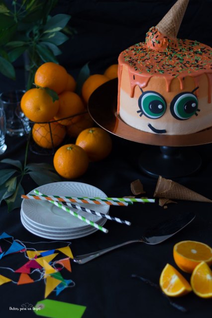 Ponemos la crema en tres mangas pasteleras para que sea más cómodo la hora de decorar y repartir la crema en tres bandas. Una vez tengamos la tarta bien cubierta, pasamos el alisador y cubrimos la parte de arriba. Volvemos a alisar y a dejar los bordes más perfectos que podamos. Volvemos a meter la tarta al frigorífico y dejamos enfriar otros 30 minutos. Pasado el tiempo, la sacamos y ponemos la bola de helado (el cake-pop reservado) encima de la crema. Ahora echamos la ganache naranja por encima de la bola y toda la parte superior de la tarta. Alisamos toda la superficie y dejamos caer los chorretes por el borde. Espolvoreamos con los sprinkles de tres colores por toda la ganache y coronamos con el barquillo antes de que se seque la ganache.