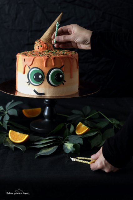 Decorada con unos ojos de fondant y una ganache de chocolate blanco de color naranja. La bola de helado es un cake-pop grande del mismo bizcocho.