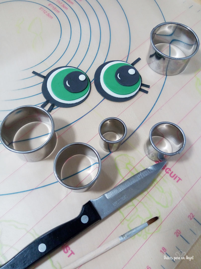Con el fondant hacemos círculos de diferentes tamaños y colores hasta hacer los ojos, procurando que sean bien finos para que no tome mucho volumen. Ponemos líneas que recortamos en negro con un cuchillo afilado para hacer las pestañas y la boca.