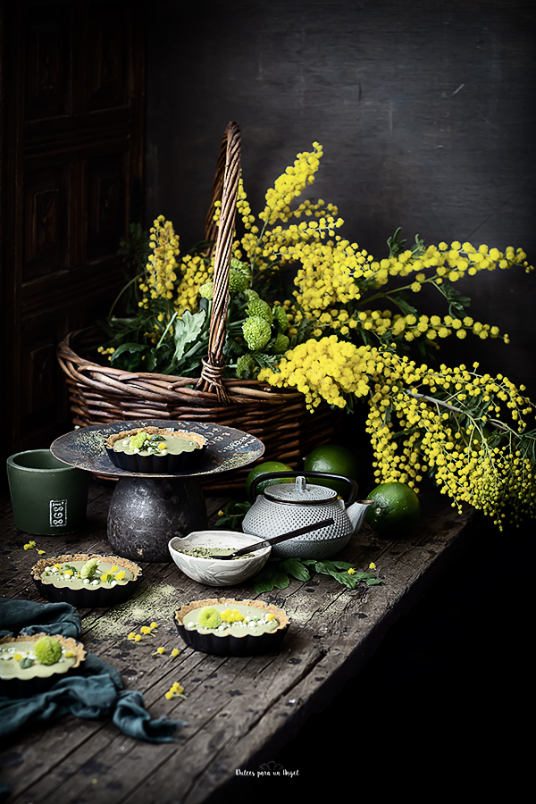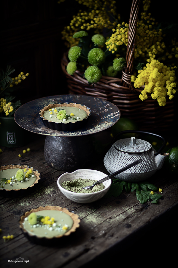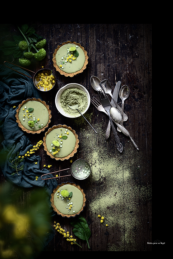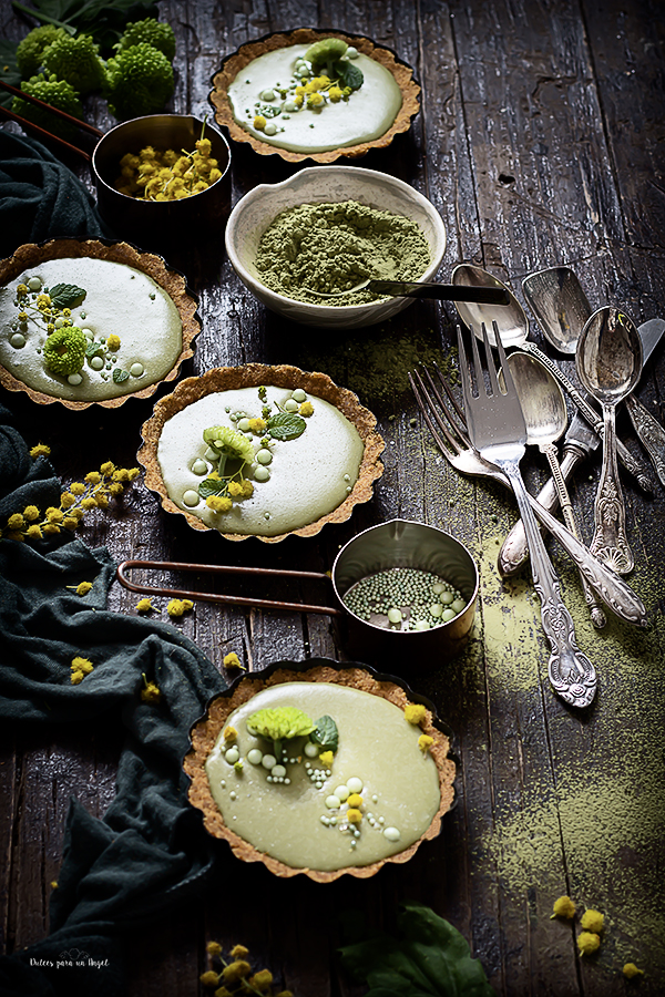 La receta de hoy son unas sencillas pero bonitas tartaletas de chocolate blanco con té matcha y base de galletas, vamos con ella.