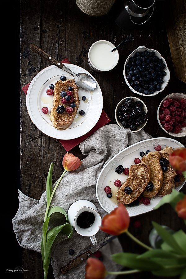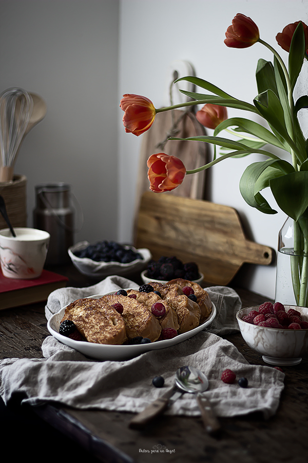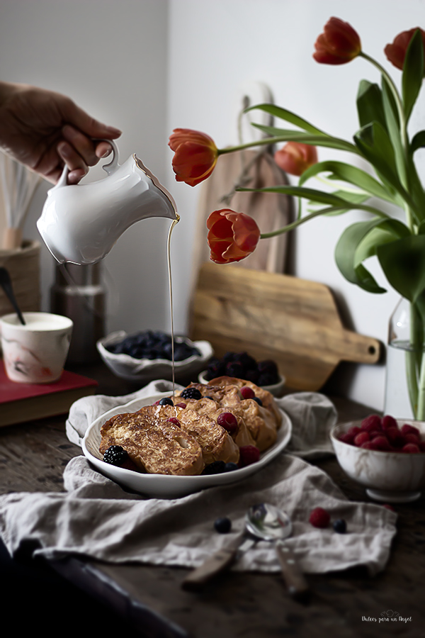 Esta semana santa hacemos torrijas y french toast. Las french toast son las torrijas francesas y las hice por primera vez el año pasado después de semana Santa y me quedé con las ganas de compartir la receta. Reconozco que soy muy fan de las torrijas pero es cierto que las hago únicamente en esta época del año y que me da un poco de pereza el momento fritura y que con las french toast no me pasa, por ello ha pasado a ser una receta muy valorada también, sobre todo para un desayuno especial.
