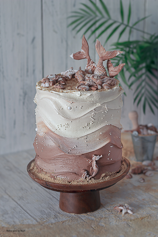 Hoy es el cumple de mi MARCOS y aquí tenéis la que ha sido la tarta para la celebración. Una tarta de chocolate rellena de chocolate y salsa de caramelo salado decorada con figuras de fondant. Es una Wave cake (tarta de olas) porque la decoración de la crema exterior se asemejan a las olas del mar. Cómo no me apetecía hacer una tarta azul se me ocurrió hacerla toda de chocolate por eso la he llamado Mar de chocolate.