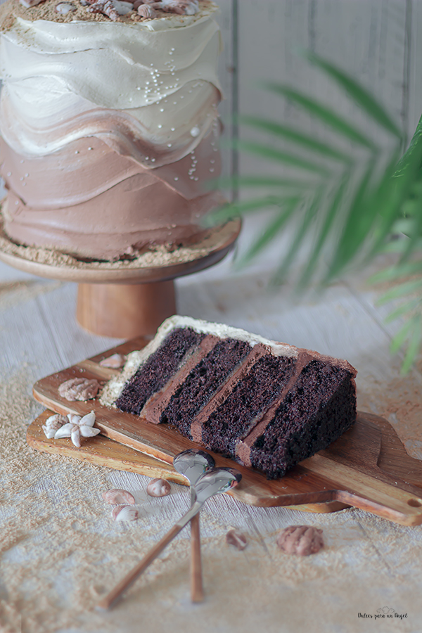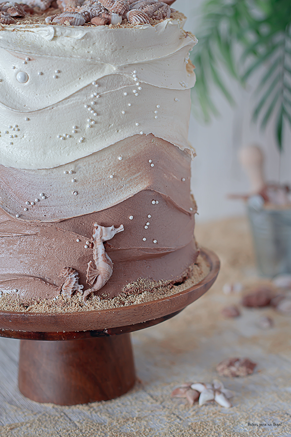 Sacamos la tarta del frigo y le ponemos una capa más gruesa, la parte de abajo de buttercream de chocolate y la de arriba con el de vainilla. Alisamos antes de hacer la decoración. Para hacer las olas hacemos girar el stand y con el pico de la rasqueta o alisador de tartas desde un lado vamos dejando la marca mientras subimos hasta el borde superior, debemos hacerlo subiendo y bajando mientras gira. Es una técnica que parece fácil pero me costó 3 intentos hasta que conseguí el efecto olas o waves.