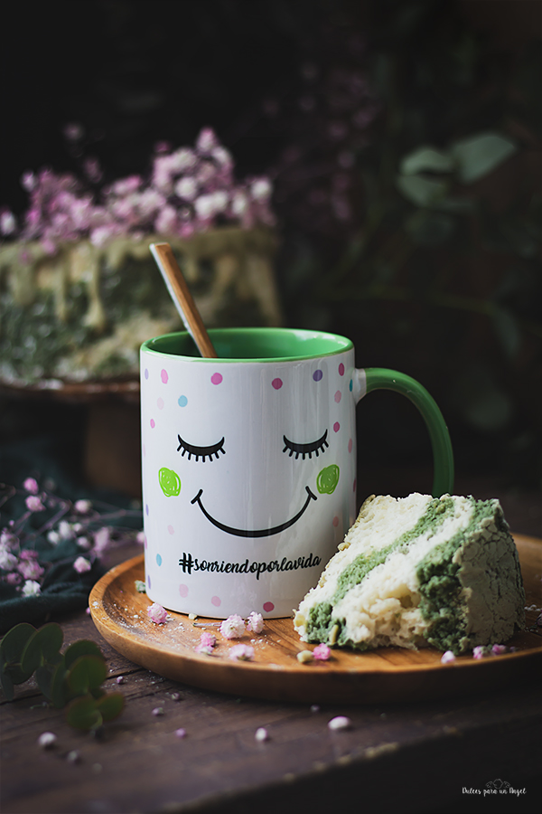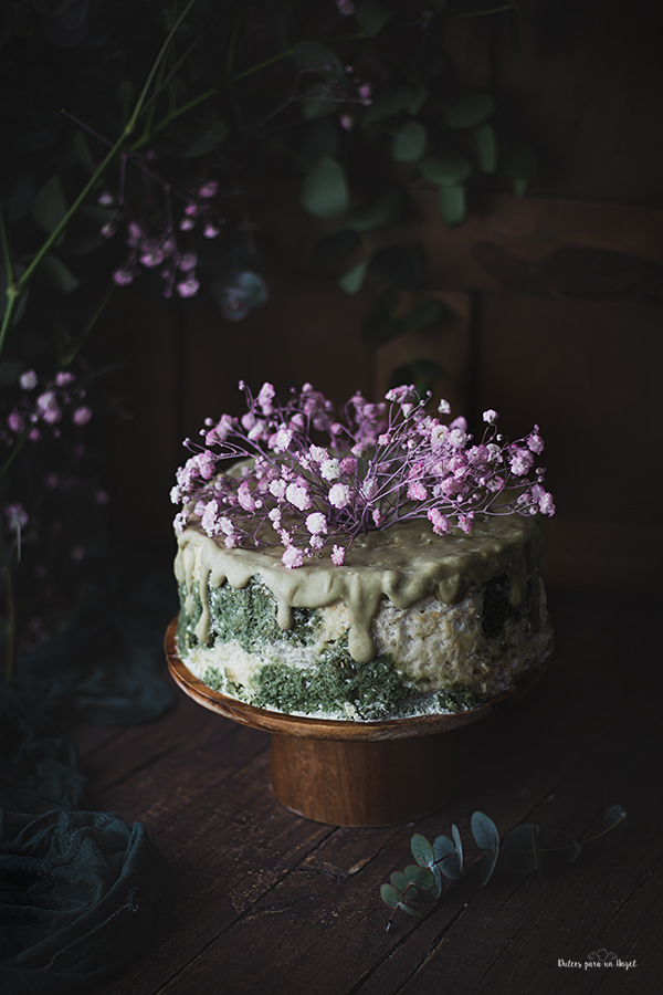 Separamos la mitad de la masa en un bol, y le añadimos el té matcha tamizado y si queremos un poco de colorante verde, mezclamos con movimientos envolventes y con mimo igualmente. Echamos la masa en el molde alternando los dos colores y repartimos de forma uniforme asegurándonos que llega a todos los huecos de la base, alisamos la superficie y metemos al horno. Horneamos durante unos 30 minutos sin abrir la puerta del horno (si el molde es de 25 cm durante 45 minutos). Para asegurarnos de que está hecho, debemos fijarnos en la parte superior, debe estar ligeramente dorada y al tocarla debe estar firme, entonces si esto es así, insertamos una brocheta o palillo para comprobar que sale seco. Si sale húmedo, dejamos 5 minutos más y volvemos a repetir el proceso.