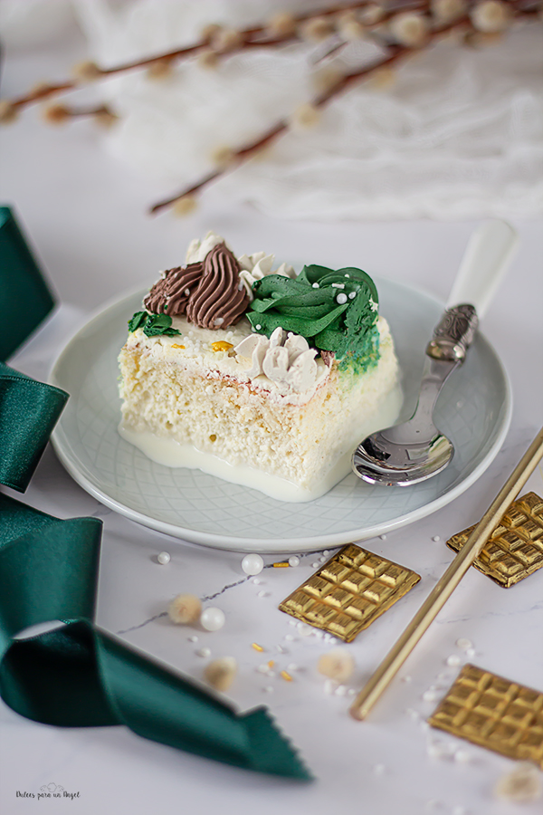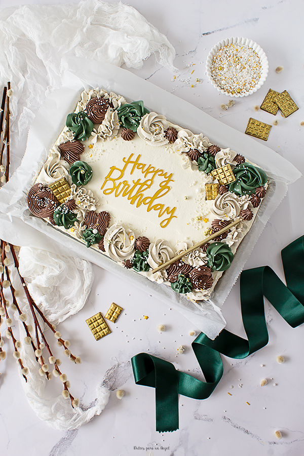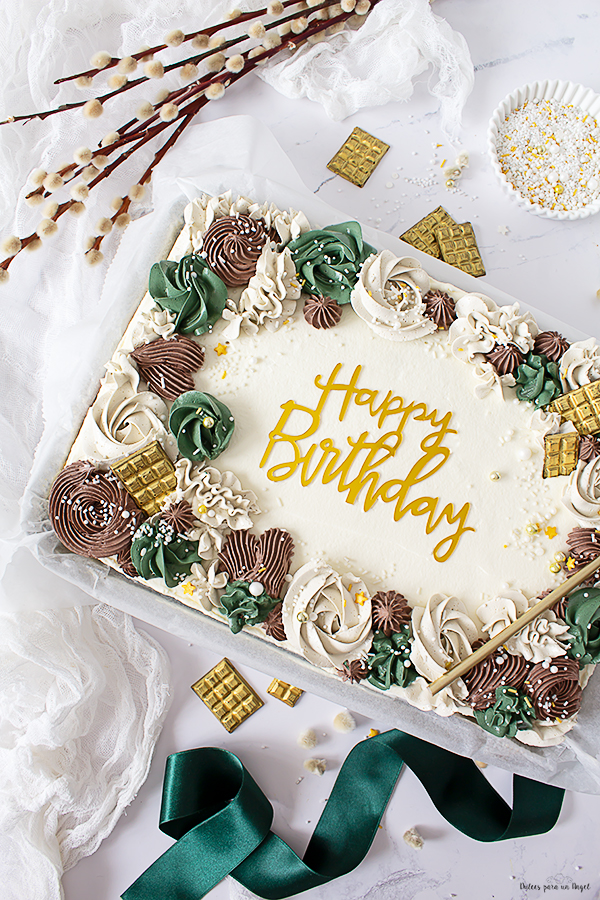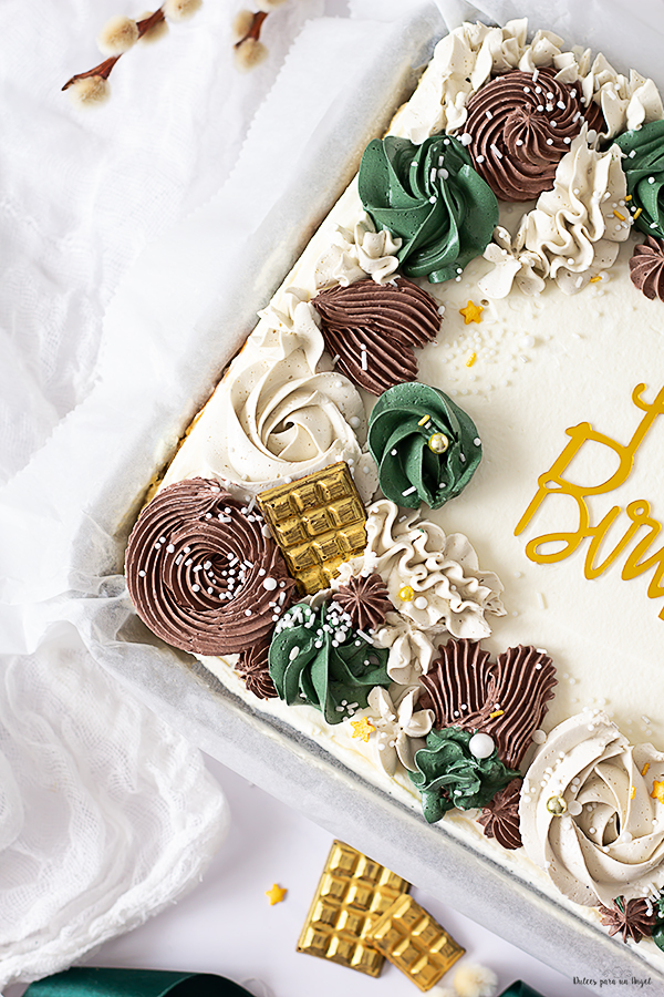 Mi sheet cake es un pastel tres leches! Como lo oyes, eso sería impensable en una tarta alta y esbelta (laterales cake) porque es un bizcocho empapado que rezuma una salsa de leche por todos sus poros. Está cubierto de crema chantilly de nata y mascarpone, la única complicación es el SMBC o crema de mantequilla suiza para las decoraciones, porque esuna crema lisa y estable que hace que los rosetones sean bonitos, definidos y perfectos. Podrías hacerlo con la crema que quieras pero ya que todo lo demás es fácil, te recomiendo que la hagas para que te quede bien bonita.