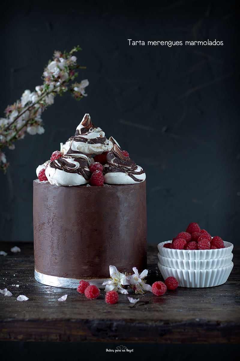 Tarta merengues marmolados (chocolate con nata, queso y frambuesas) – por mi 40 cumpleaños